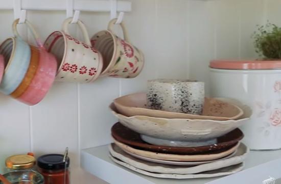 讲究仪式感的Dolly还会自己动手制作许多小物件,比如厨房里的陶瓷杯、碗,是她自己亲手烧制的。