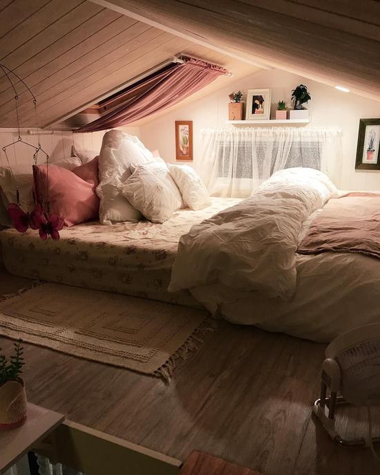 她在阁楼上的卧室开了一扇天窗,不仅可以满足基本的采光需求,还能带来愉悦的视觉体验,白日里赏云,暗夜里观星,诗意且浪漫。